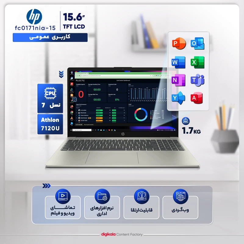 لپتاپ ۱۵.۶ اینچی اچپی مدل fc0171nia در این پیکربندی با پردازنده AMD Athlon 7120U و حافظه رم ۸GB LPDDR5 برای استفاده روزمره سبک بهینهسازی شده است. وزن دستگاه ۱.۷ کیلوگرم و ابعاد آن ۱۷.۹×۲۴۲×۳۵۸.۵ میلیمتر است و بدنه از طراحی ساده و کمحجم برخوردار است. پردازنده Athlon 7120U با دو هسته و دو رشته و فرکانس ۲.۴ تا ۳.۵ گیگاهرتز همراه با حافظه کش ۲MB عملکردی مناسب برای اجرای برنامههای پایه ارائه میدهد. پردازنده گرافیکی مجتمع Radeon 610M نیز برای نمایش محتوای تصویری و اجرای برنامههای سبک کافی است. این مدل از رم LPDDR5 با فرکانس ۴۸۰۰MHz و ظرفیت ۸GB استفاده میکند که روی برد لحیم شده و قابلیت ارتقا ندارد. حافظه داخلی ۲۵۶GB از نوع SSD NVMe است و امکان ارتقای آن وجود دارد. صفحهنمایش ۱۵.۶ اینچی Full HD با پنل TFT LCD و نرخ نوسازی ۶۰Hz برای استفاده طولانی قابل قبول است. روکش مات کمک میکند بازتاب نور کاهش یابد. نسبت تصویر ۱۶:۹ ساختار استانداردی برای نمایش محتوا فراهم میکند. باتری سه سلولی با ظرفیت ۴۱Wh انرژی دستگاه را تأمین میکند. مجموعه پورتها شامل یک USB 2.0، یک USB 3.2 Type‑A، یک USB 3.2 Type‑C با سرعت ۵Gbps (بدون پشتیبانی از شارژ و خروجی تصویر)، HDMI، جک ۳.۵ میلیمتری صدا، Wi‑Fi و Bluetooth است. وبکم داخلی برای استفاده عمومی مناسب است. صفحهکلید فاقد نورپردازی است و تاچپد با حساسیت مناسب واکنش دقیقی ارائه میدهد. سیستمعامل روی دستگاه نصب نیست و کاربر میتواند نسخه دلخواه خود را نصب کند. این مجموعه ویژگیها لپتاپ را به انتخابی مناسب برای استفاده روزمره و اجرای برنامههای سبک تبدیل میکند.